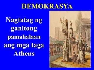 Nanggaling ito sa salitang Demos na ang ibig sabihin ay tao at Kratos na ang ibig sabihin. Ang klima ng Greece ay angkop sa pagtatanim ng ubas olive trigo at barley. Cleisthenes nagpatupad ng isang bagong konstitusyon na naging batayan ng pagiging demokrasya ng athens hinati ang lungsod sa mga bagong distrito na tinatawag na deme o mga bayan.