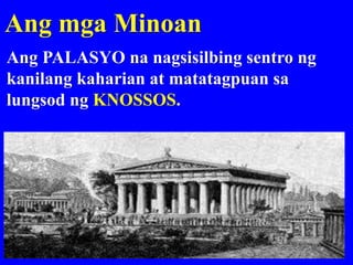 KABIHASNANG MINOAN kauna-unahang kabihasnang umusbong sa Greece Crete Pinamunuan ni Haring Minos na. Ang Greece ay nasa timog na dulo ngBalkan Peninsulasa Timog Silangang Europe.