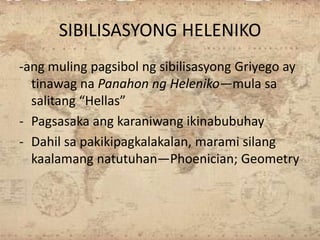 Kontribusyon ng Kabihasnang Klasiko sa Pag-unlad ng Pandaigdigang Kamalayan Unang Edisyon 2020 Isinasaad sa Batas Republika 8293 Seksiyon 176 na. Ang mga sinaunang kabihasnan sa daigdig partikular sa Asya Africa at America ay nag-iwan ng mga kahanga-hangang pamanang maipagmamalaki sa lahat ng panahon at nakapagbigay ng malaking kapakinabangan sa pamumuhay ng mga tao sa kasalukuyan. Hellene Katawagan ng mga Greek sa kanilang mga saril Hango ito sa salitang Hellas na tumutukoy sa kabuuang.
