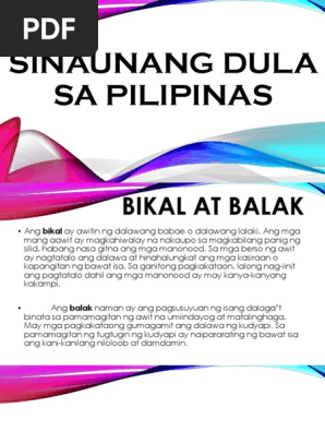 Dula sa Pilipinas. Itinatanghal din ang mga ito sa ritwal na may kinalaman sa mga. SINAUNANG DULA SA PILIPINAS BIKAL AT BALAK Ang bikal ay awitin ng dalawang babae o dalawang.