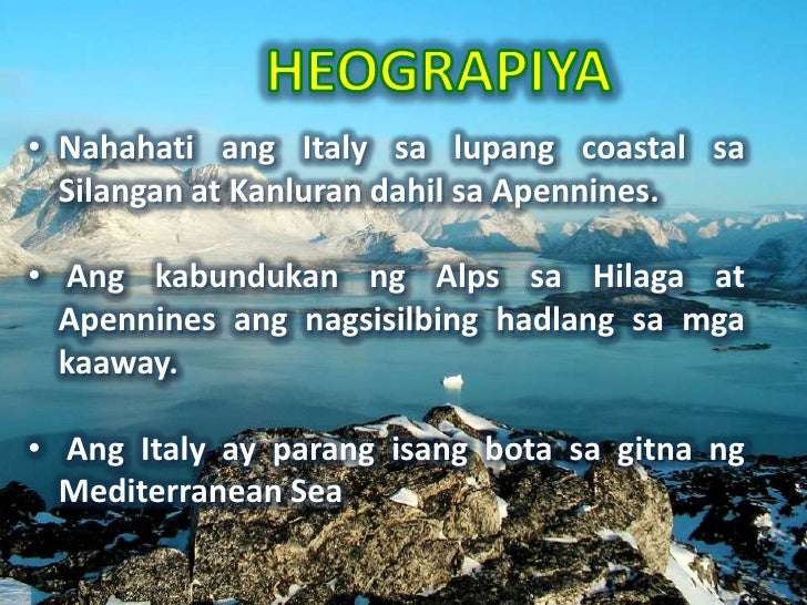 Ang Italy ay parang isang bota sa gitna ng Mediterranean Sea. Siya rin ang unang nakapagpaliwanag kung bakit lumulutang sa likidong tul ad ng tubig ang mga bagay. Ang mga tao ay natutong makibagay sa pabago-bagong klima sa nararanasan.