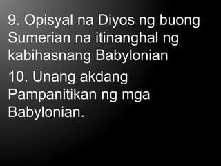 Binubuo ito ng 282 batas tungkol sa ibat ibang aspekto ng pamumuhay sa Mesopotamia. Ang Babylonia ˌbæbɪloʊniə ay isang sinaunang Akkadian na nagsasalita ng estado at kultural na lugar na nakabatay sa gitnang-timog Mesopotamia kasalukuyan-araw na Iraq. KABIHASNANG SUMER Ang mga Sumerian ay bihasa sa pagpapalago nga ibat ibang pananim at iyon ang naging hudyat upang sila ay magtagal sa isang lugar.