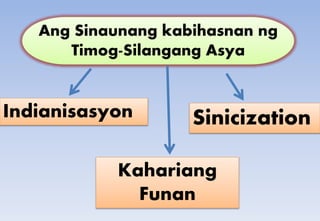 Start studying Mga Sinaunang imperyo sa timog silangang asya. Ilog na sentro ng mga unang kabihasnan sa Timog Asya. Timog Silangang Asya - Mga Kabihasnan.