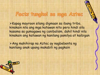 Nagsasagawa ang mga Mayan Aztec at Inca ng human sacrifice. Ang pamumuno ng Aztec ay itinuturing na isang imperyo ng pagkuha. To play this quiz please finish editing it.