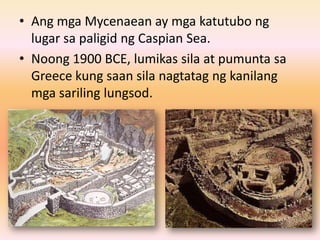 KABIHASNANG MYCENAEAN Bago pa man salakayin at sakupin ng mga Mycenaean ang Crete nasimulan na nilang paunlarin ang ilang pangunahing kabihasnan sa Timog Greece.