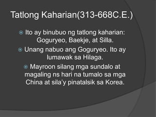 Mula kay Gyuwon Sahwa na tinuring na mala-alamat. Ang kanilang kultura ay humalo sa unang. Ang Tatlong Kaharian ng Korea ay ang mga kaharian ng Goguryeo Baekje at Silla na sumaklaw sa Tangway ng Korea at Manchuria sa pagitan ng unang siglo BC at ikapitong siglo ADMayroon ding maliliit na kaharian at mga estadong tribo bago at kasabay ng panahon ng Tatlong Kaharian kinabibilangan ng Gaya Dongye Okjeo Buyeo Usnan Tamna at iba pa.